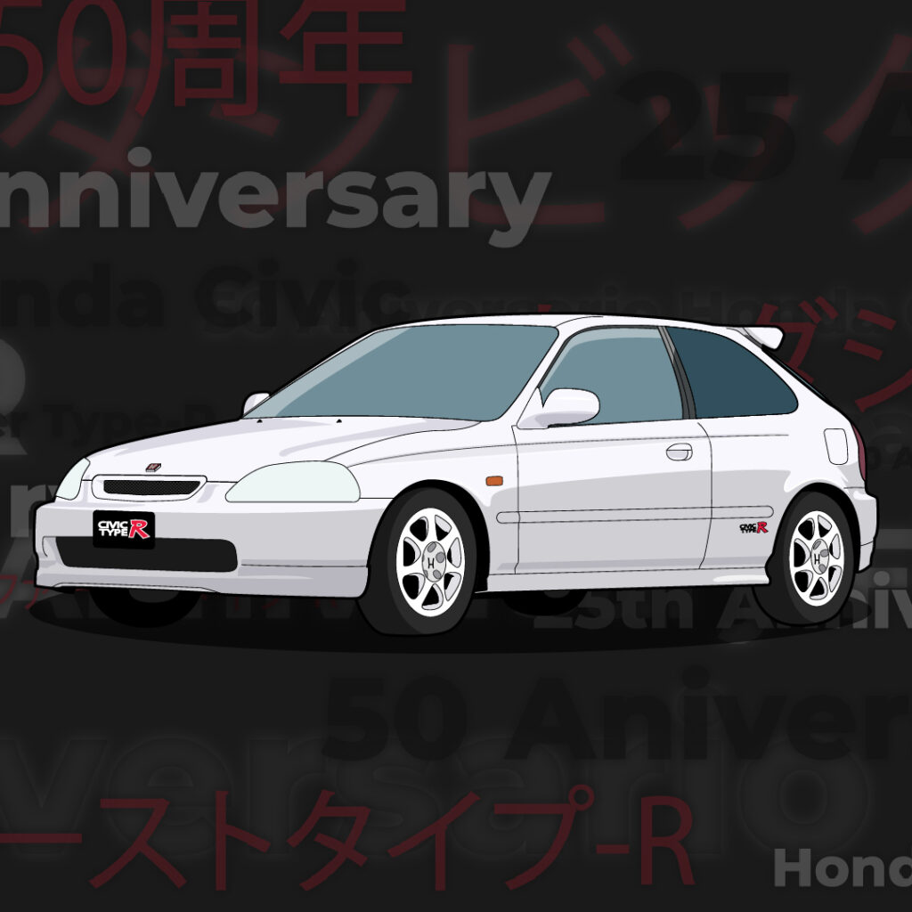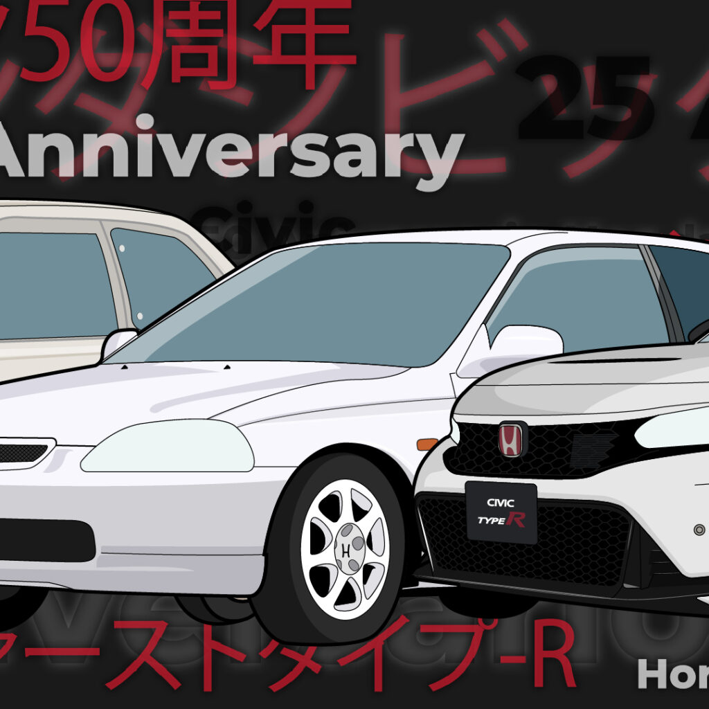 Ilustración compuesta en 3 post haciendo referencia a el 50 aniversario del Honda Civic y a su vez al 25 aniversario del primer TYPE-R, la versión deportiva del mismo.